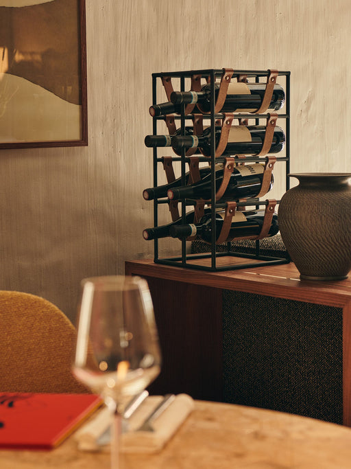 AudoPreço €350,00 - Preço €350,00Preço€350,00€350,00 - €350,00Preço atual €350,00Arthur Umanoff’s mid-century modern wine rack combines black powder coated steel with leather for an industrial look. Holding 8 bottles, the reissu...