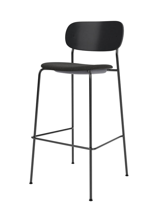 Co Bar Chair, Black Steel Base, Upholstered Seat, Oak Veneer Backrest, PC1T, Black Oak, EU/US - CAL117 Foam, 0198 (Black), Re-wool, Re-wool, Kvadrat