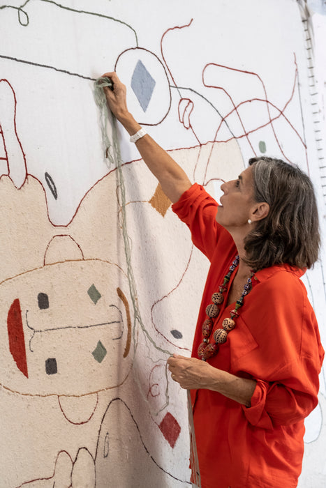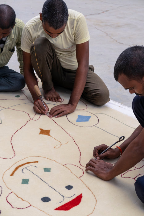 Depicted with a delicate line, the illustration defines the silhouettes of several imaginary characters that intertwine and coexist in a beautiful composition. Nine faces are arranged at different angles so the rug can be seen from any perspective, fitting perfectly into any space.