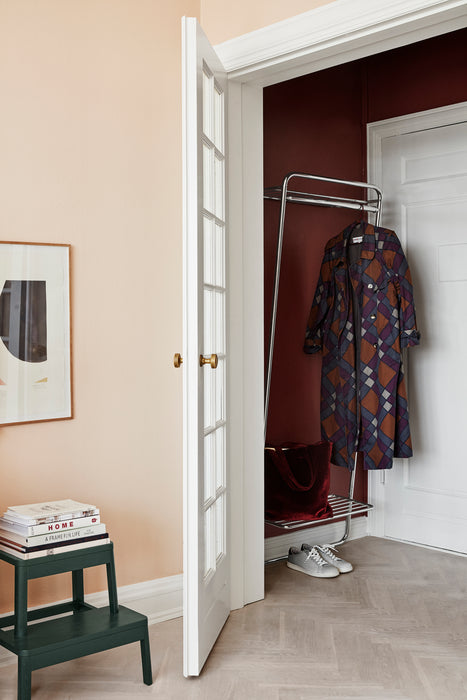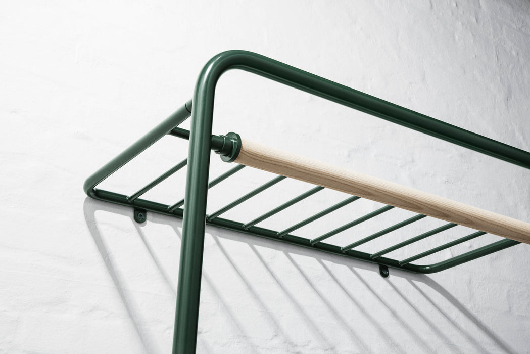 En tant que premier produit conçu pour répondre au besoin de solutions efficaces pour l'organisation de petits espaces, LIBERTINE Rack est un design sans fioritures avec des racines industrielles et un ton scandinave. Avec sa construction mince et stable, qui repose sur le sol et s'appuie contre le mur, LIBERTINE Rack est une solution minimale et fonctionnelle en trois plans. Sa structure enduite de poudre, disponible en quatre couleurs, est associée à un poteau rond en chêne qui émet un son agréable lorsqu'un cintre est posé dessus. LIBERTINE Rack est également disponible dans une version chromée, qui fait référence à l'accent mis par la période Bauhaus sur les chaises en porte-à-faux en acier tubulaire.