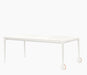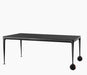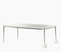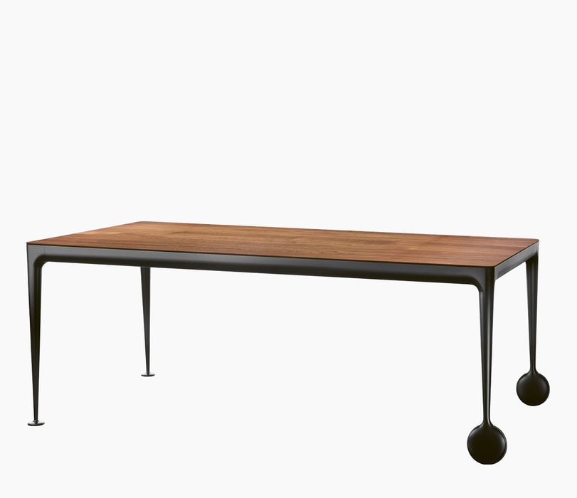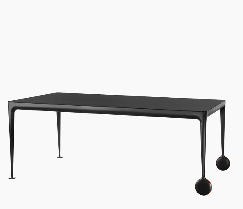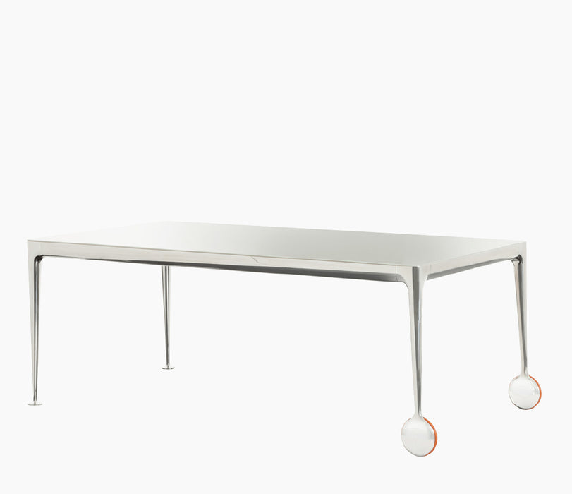 Materiais: pés em alumínio fundido, polido ou pintado. Cruzetas em alumínio polido ou pintado. Tampo em vidro temperado (acabamento brilhante), gravado a ácido (acabamento mate) ou em nogueira americana. Rodas e pés em borracha. Folhas para versão extensível em laminado de MDF pintado (acabamento mate).