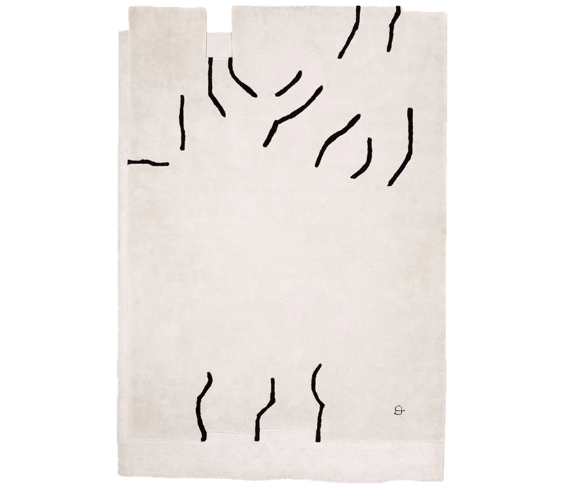 Inspired by the artwork of Eduardo Chillida, this indoor rug pays tribute to the collage Gravitación Tinta 1996.