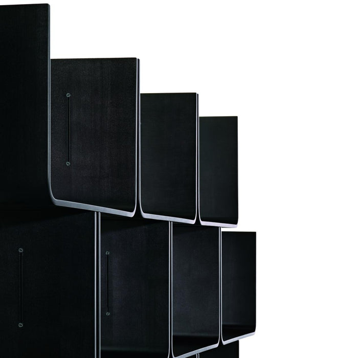 Materiais: Sistema de estantes. Unidades empilháveis e adjacentes. Material: contraplacado de bordo (acabamento natural ou preto manchado).