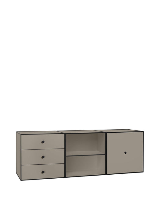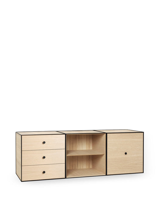 A flexible storage solution comprising three Frame modules mounted in cubist frames. Including a module with a shelf, a module with a door and a module with three drawers, this simple storage system is inspired by Mogens Lassen’s iconic Kubus candle holder and based on a strict mathematical formula. Drawers feature a soft close system and hidden tracks. Crafted with the greatest precision, Frame modules are available in four sizes and can be hung on a wall or set on a floor. Combine Frame modules to create a bookcase, room divider or something else entirely – the possibilities are endless. Frame modules are available with or without doors, shelves and drawers, allowing you to create the perfect storage solution to match your needs.