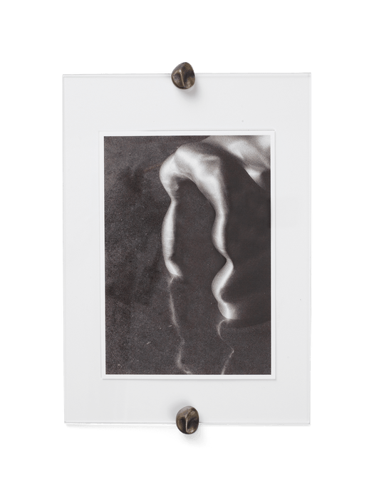 Elevate your space with a touch of sophistication and personal flair using the Gravel Picture Frame. This exquisite, modern frame comprises two sheets of acrylic, seamlessly connected by sculptural, cast brass brackets resembling small pieces of gravel. To display your chosen picture, effortlessly affix the two brass brackets onto the wall. Insert the picture between the two acrylic sheets, and then secure it by placing the cast brass caps onto the brackets. Your picture is now elegantly and securely framed.