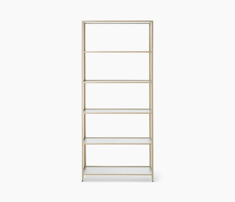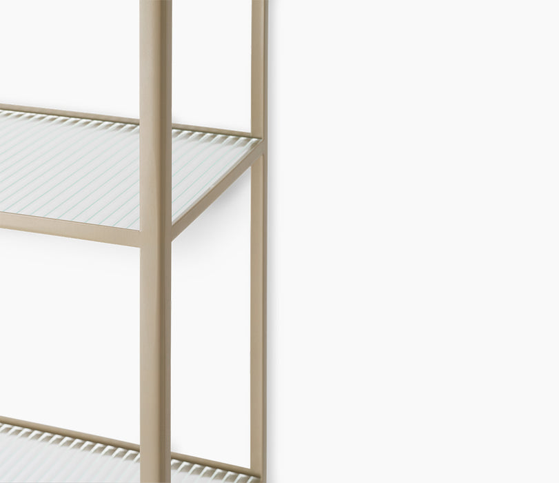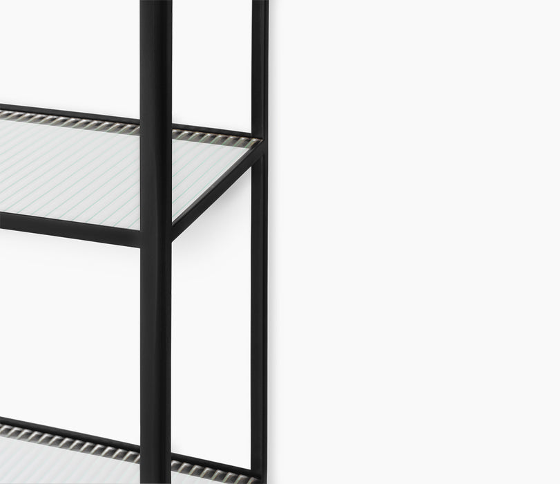 Misturando a estética do design industrial com o moderno, a Haze Bookcase apresenta uma estrutura metálica elegante com prateleiras de vidro estriado.
