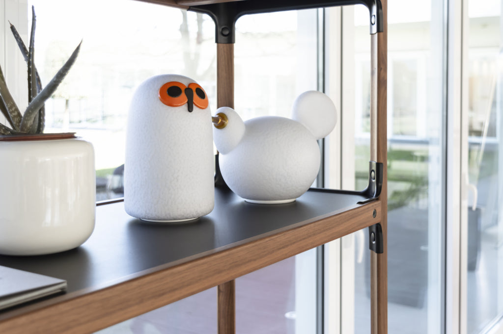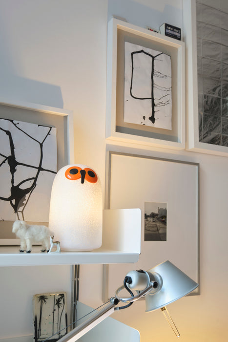 Dispositivo de iluminação de mesa recarregável com luz difusa.