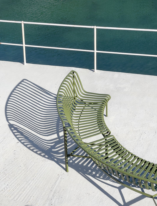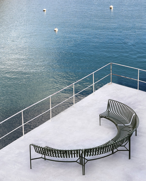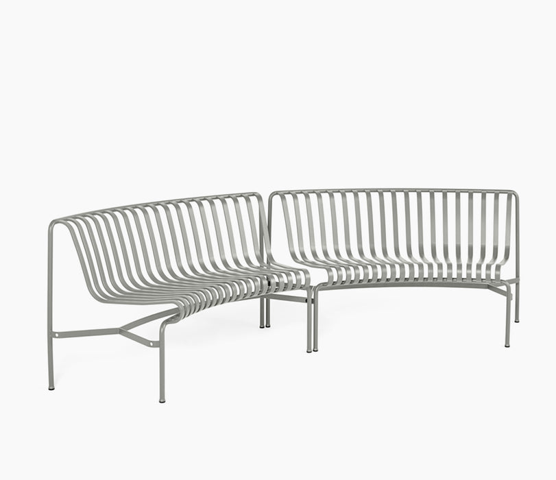 Projetado pela dupla francesa Ronan e Erwan Bouroullec, o Palissade Park Dining Bench é um banco modular projetado para uso externo. A estrutura curva vem em duas variantes, projetadas para se curvar em duas direções diferentes, permitindo que os bancos fiquem voltados para dentro, para fora ou uma combinação dos dois. Ao conectar um mínimo de dois bancos, podem ser criados arranjos de assentos personalizados em layouts como círculos, ondas e arcos. Esta combinação apresenta dois bancos virados para o interior, proporcionando um ponto de partida para personalizar diferentes layouts.