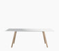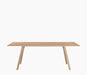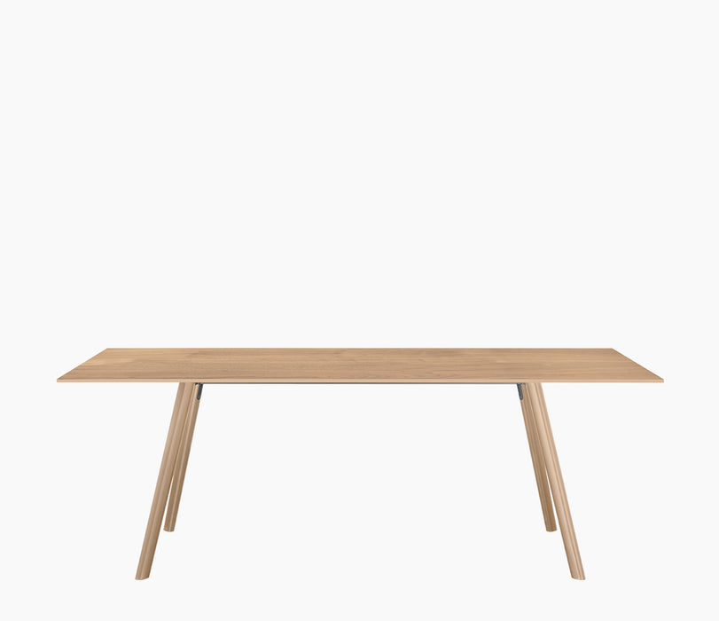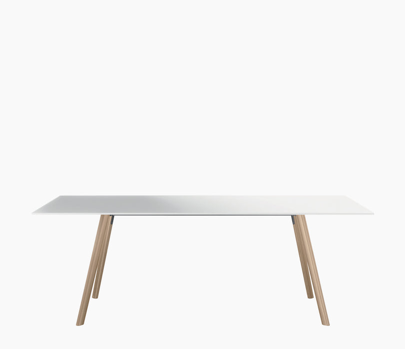 Materiais: Pés em freixo maciço pintado, em faia natural ou em carvalho maciço natural; cruzetas em tubo de aço pintadas em resina epóxi; juntas em alumínio fundido lixado ou pintado com resina epóxi. Tampo em HPL, ou em carvalho natural folheado. Mesa disponível em diferentes dimensões.