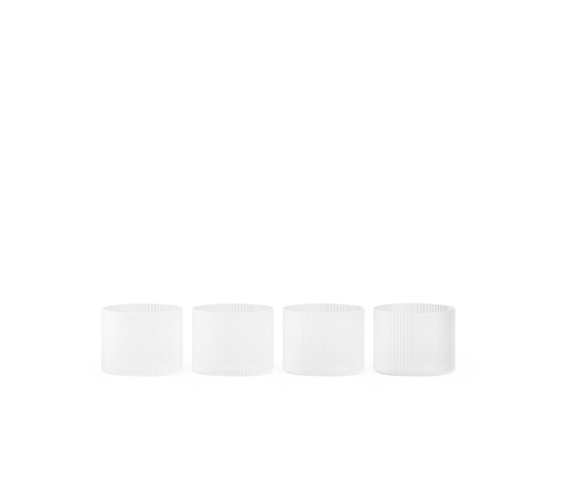 Feito como uma versão pequena dos copos Ripple originais, este conjunto de quatro copos é um novo membro elegante da sua mesa. Eles são feitos à mão e cada um dos quatro apresenta o uso distinto de níveis geométricos que caracterizam a série. Use-os para o seu licor favorito, condimentos ou talvez até mesmo como um copo de ovo.