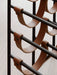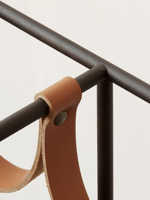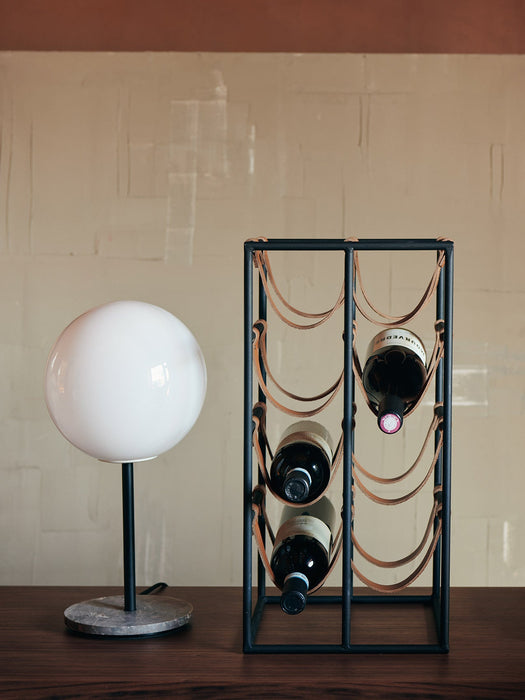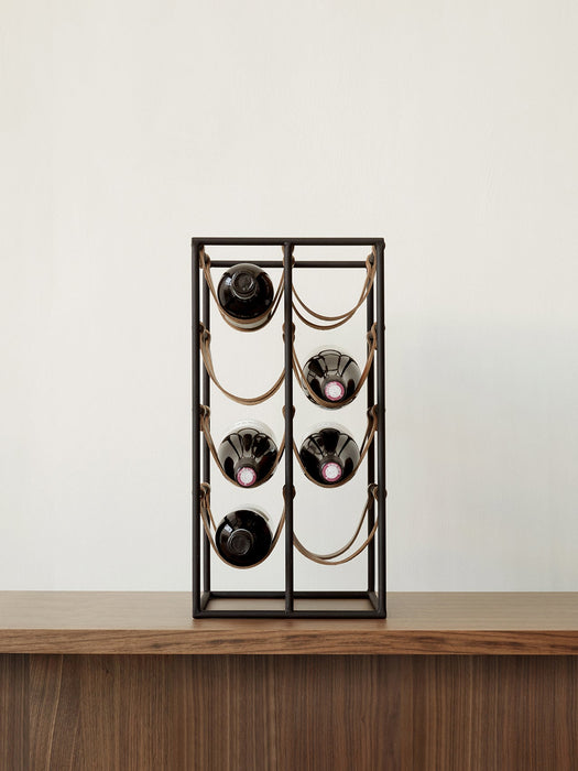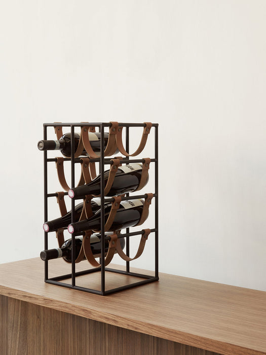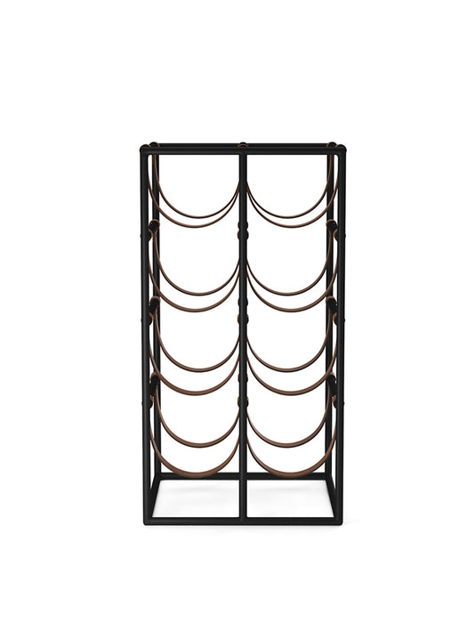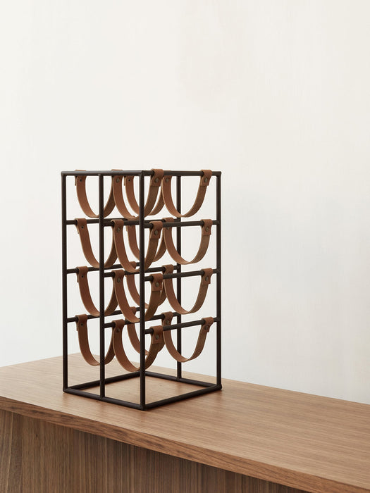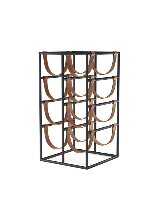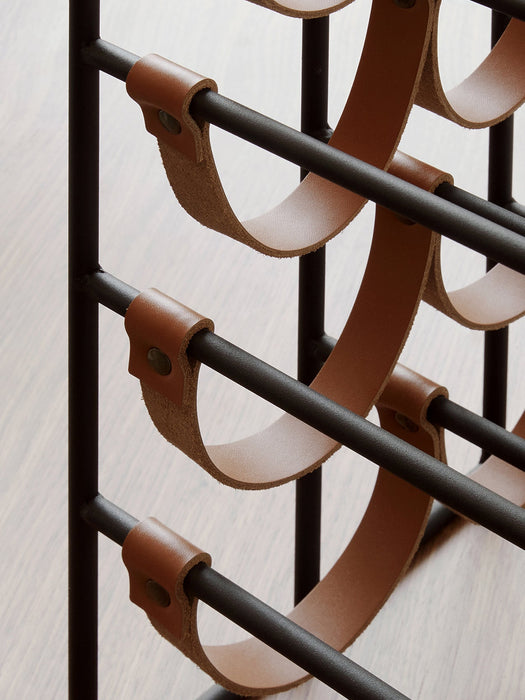 Arthur Umanoff’s mid-century modern wine rack combines black powder coated steel with leather for an industrial look. Holding 8 bottles, the reissued design is ideal for wine cellars or as a standalone rack in a kitchen or dining room for keeping bottles within easy reach. The timeless design doubles as a sculptural feature.