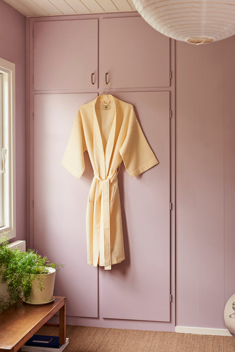 O Roupão Waffle é feito em algodão macio e absorvente, e caracterizado pela textura waffle tridimensional. Com um formato descontraído, dois bolsos e um cinto de gravata, ele vem numa variedade de cores elegantes.